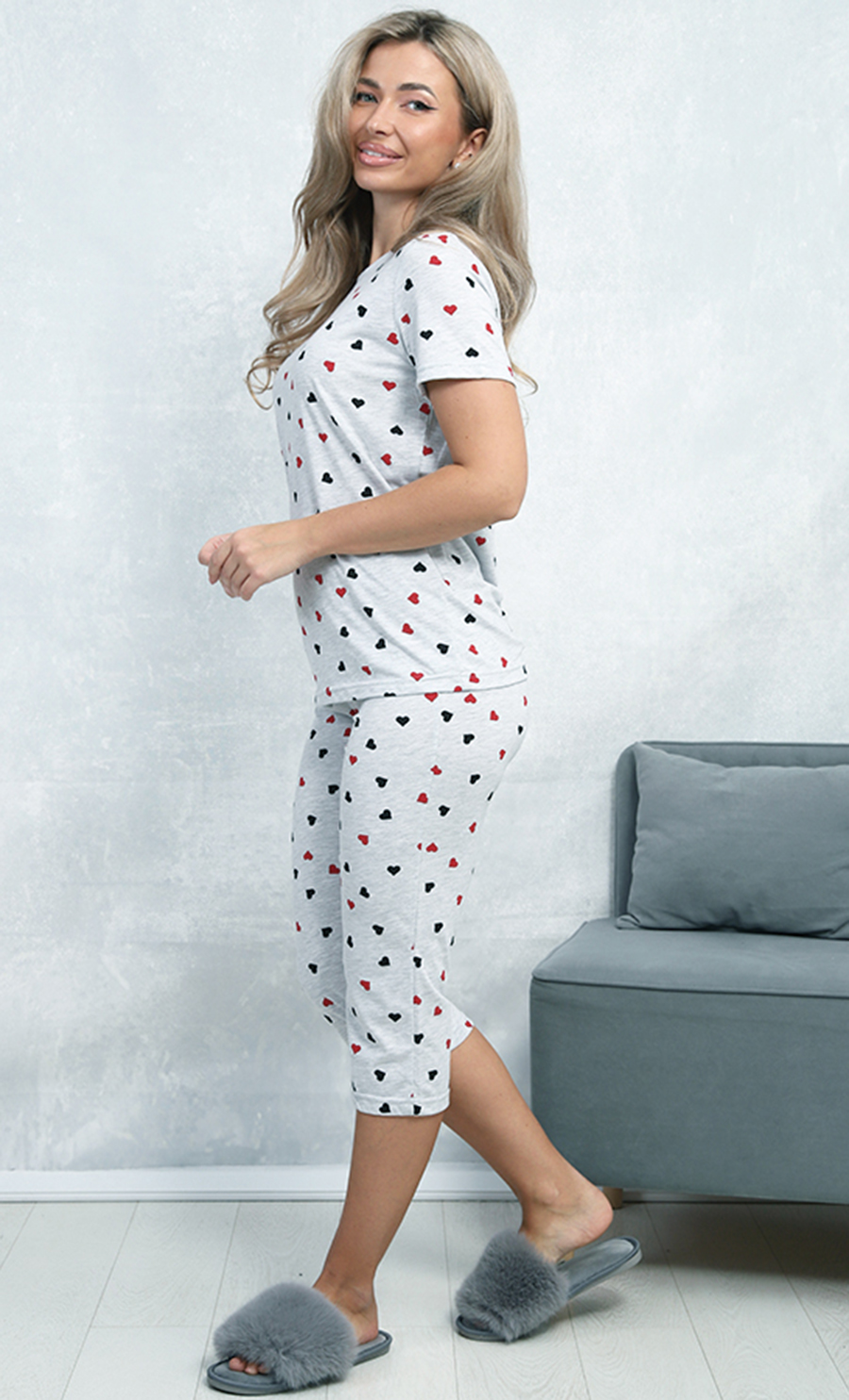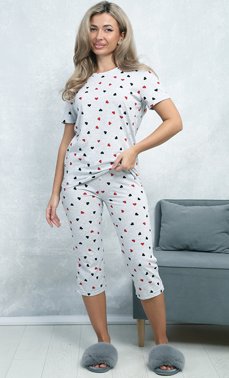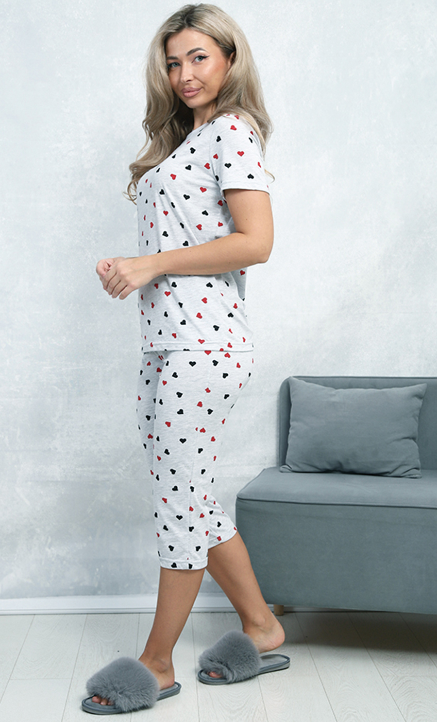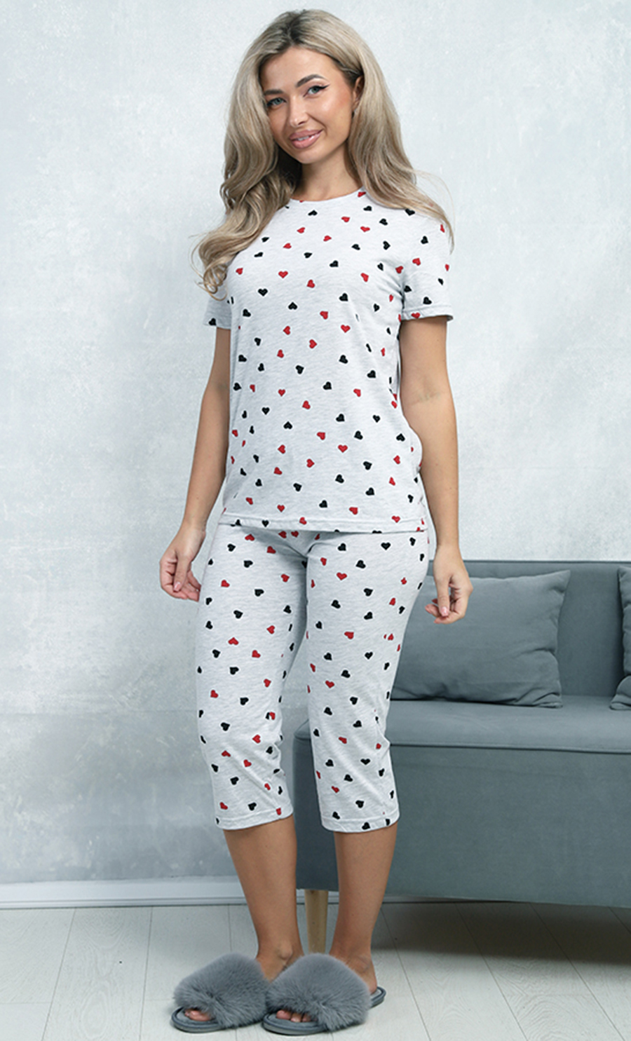 Пижама П-4806 выполнена из кулирки 100% хлопка — мягкого, натурального и дышащего материала. Свободный крой футболки с короткими рукавами и укороченные брюки создают удобный и милый домашний образ. Принт сердечек придаёт изделию нежность и уют.