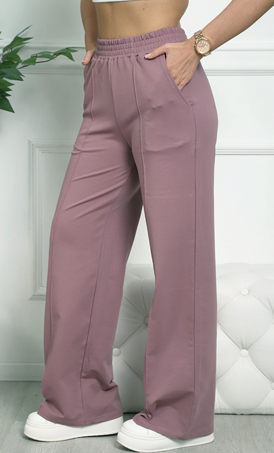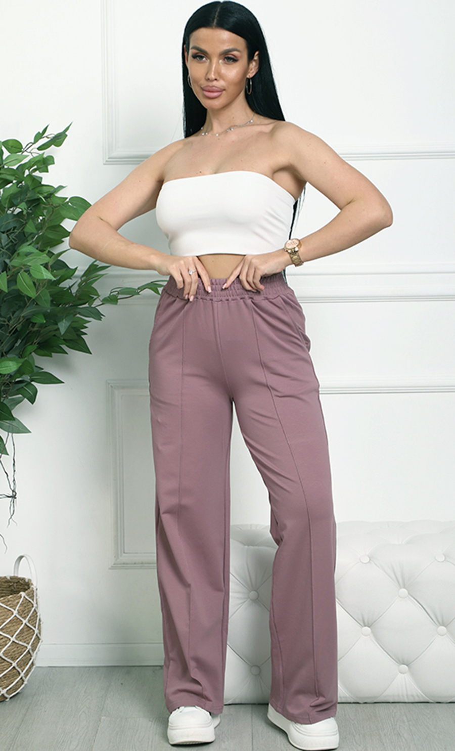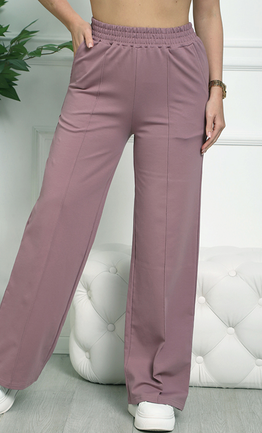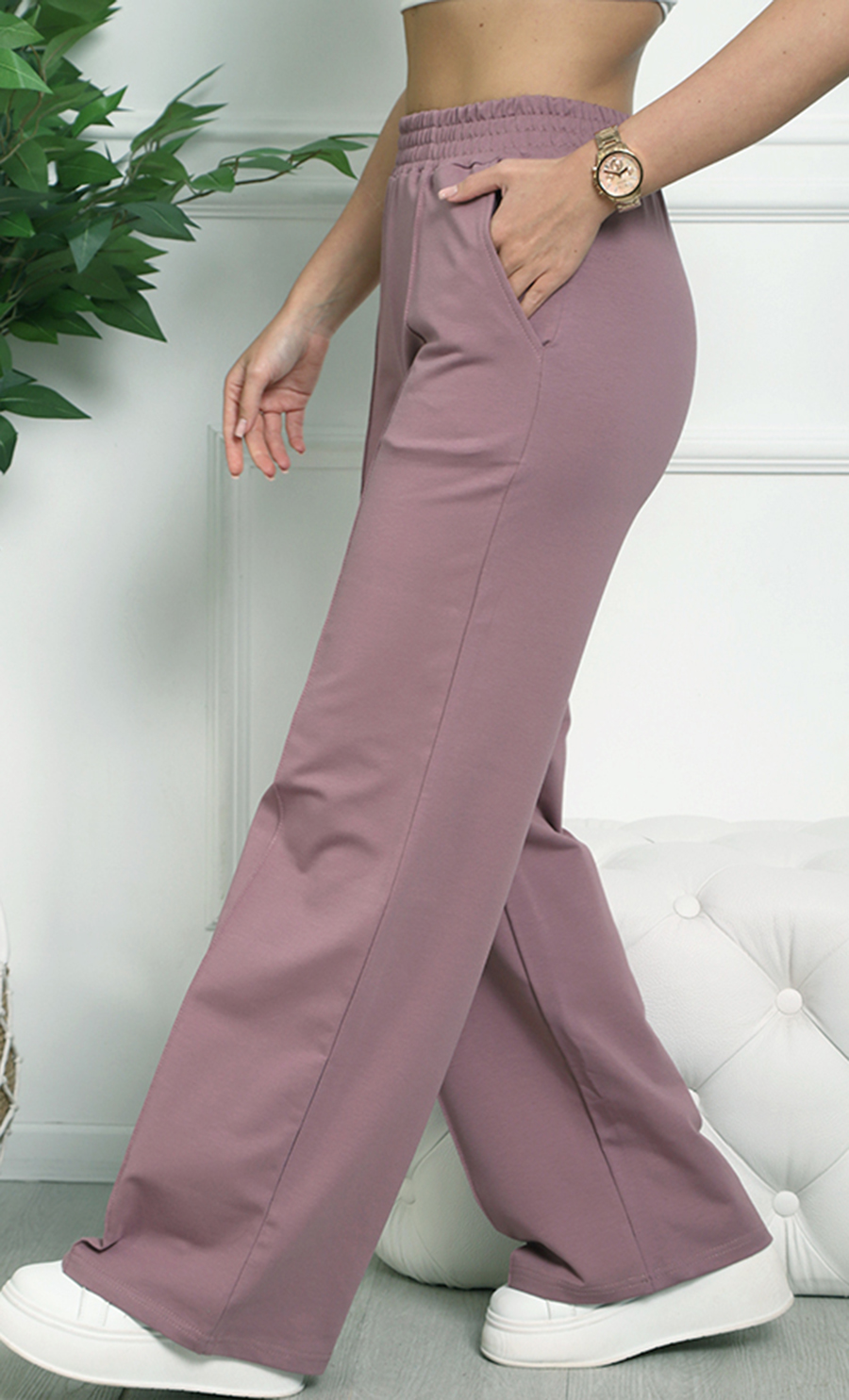 Брюки К-4848 / 1 изготовлены из футера 2х-нитка (95% хлопок, 5% эластан) — мягкого и эластичного материала. Модель с широкой свободной посадкой и высокой талией на эластичном поясе гарантирует комфорт и свободу движений, создавая стильный и спокойный образ.