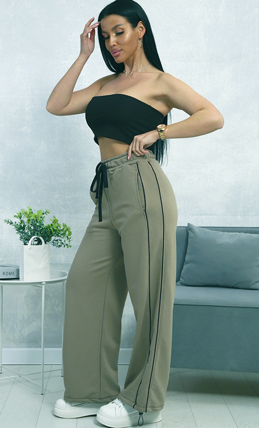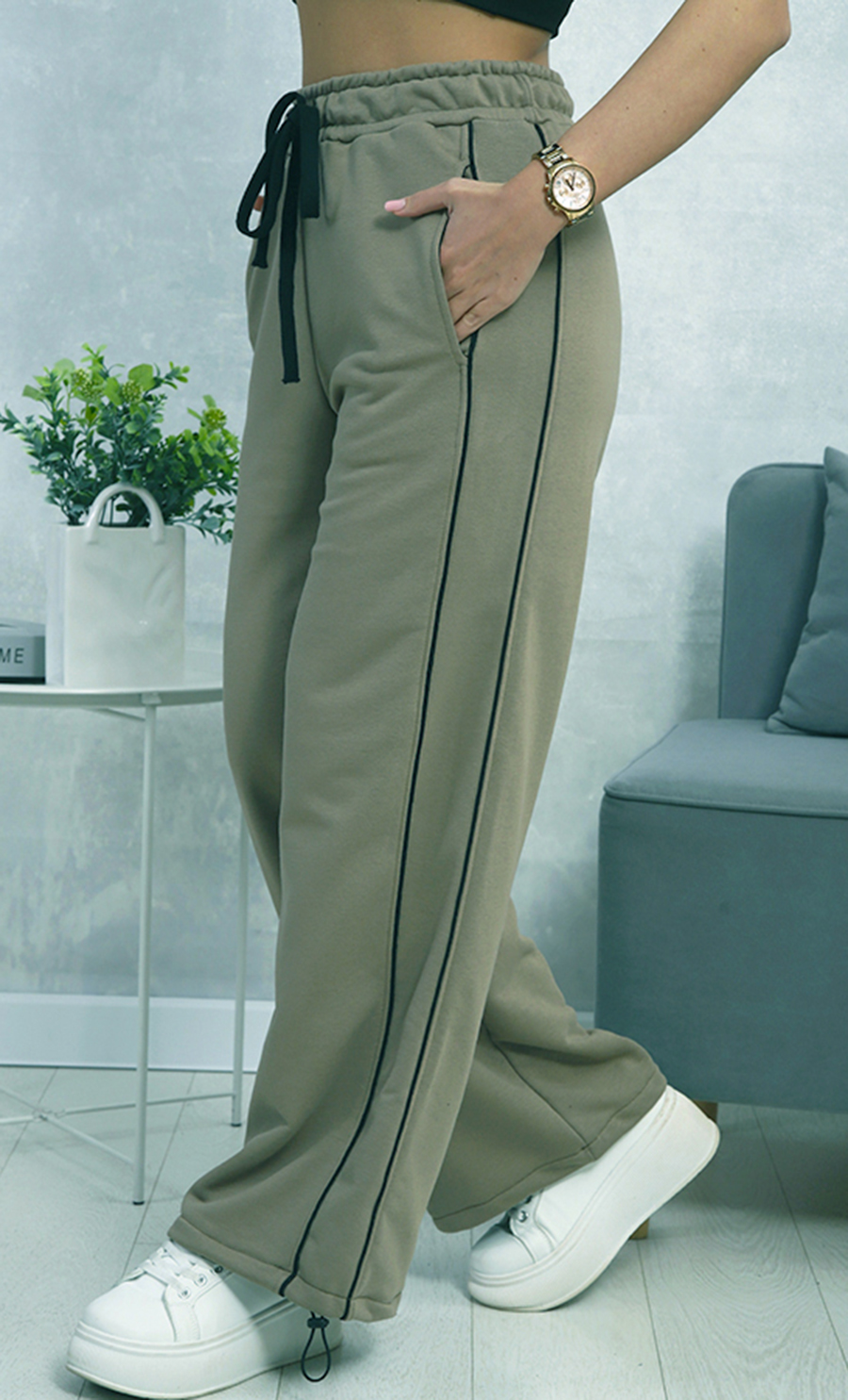 Брюки К-4846⁄2 выполнены из футера 2х-нитка (95% хлопок, 5% эластан) — мягкого, эластичного и комфортного материала. Модель свободного кроя с эластичным поясом и шнурком, а также тонкой контрастной чёрной полосой по бокам, создаёт стильный и практичный образ для дома и активного отдыха.