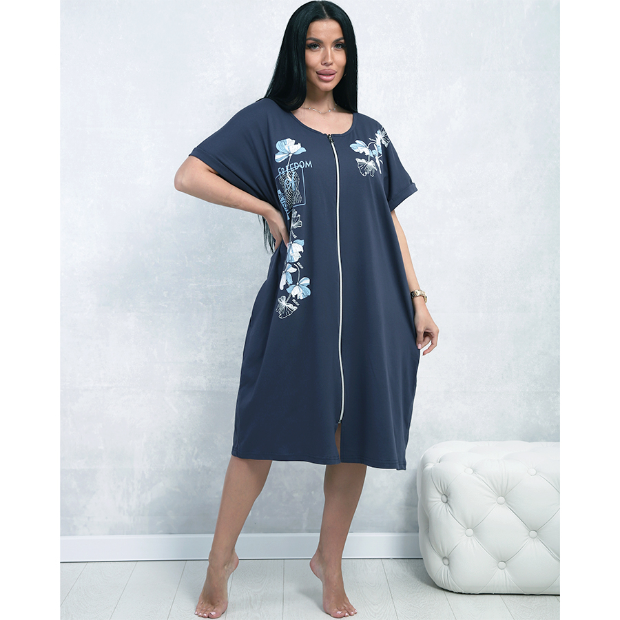 Халат Д-4839 изготовлен из кулирки 100% хлопка — мягкого, натурального и дышащего материала. Удобный свободный крой с короткими рукавами и застёжкой на молнии обеспечивает комфорт в носке. Цветочный принт и надпись «FREEDOM» придают модели нежность и современный стиль.