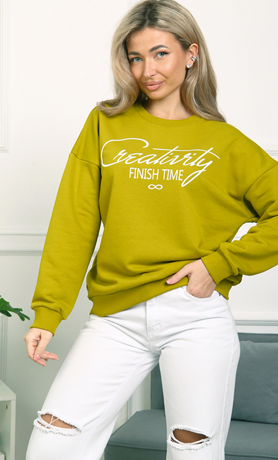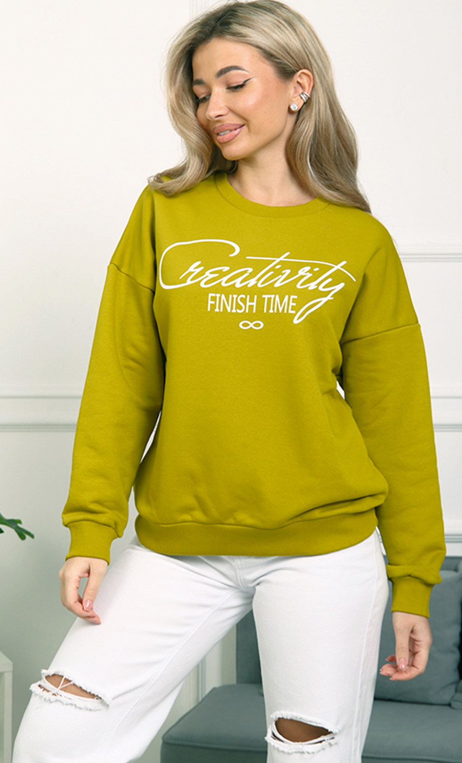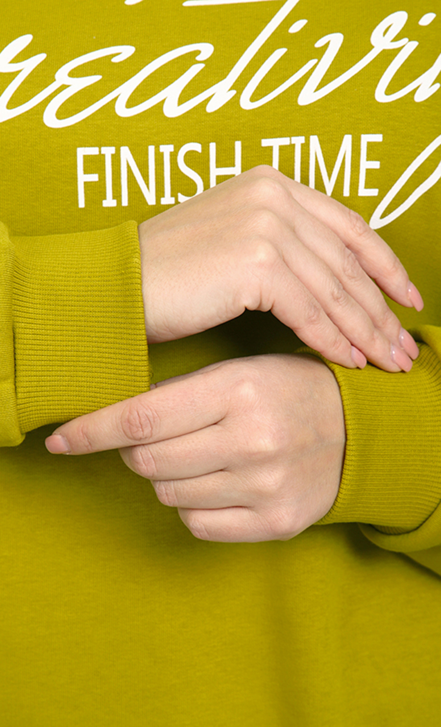 Толстовка БК-4807 / 2 выполнена из футера 3-нит петля (96% хлопок, 4% лайкра) — мягкого, эластичного материала, обеспечивающего комфорт и хорошую посадку. Свободный крой со спущенными плечами и эластичные манжеты создают уютный и стильный образ. Надпись “Creativity Finish Time” добавляет изделию модный акцент.