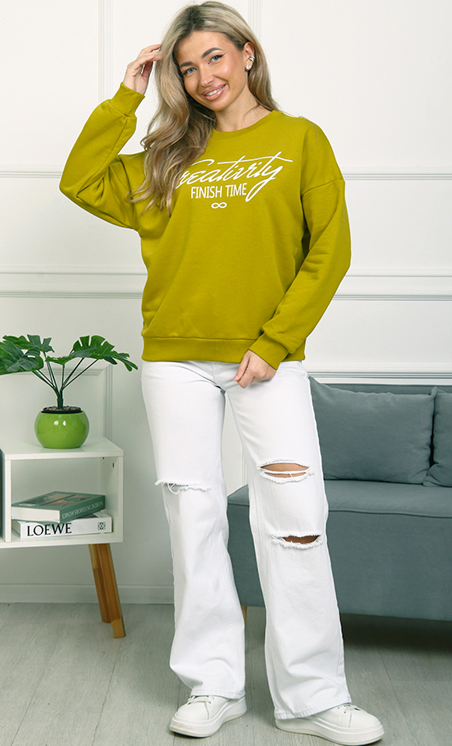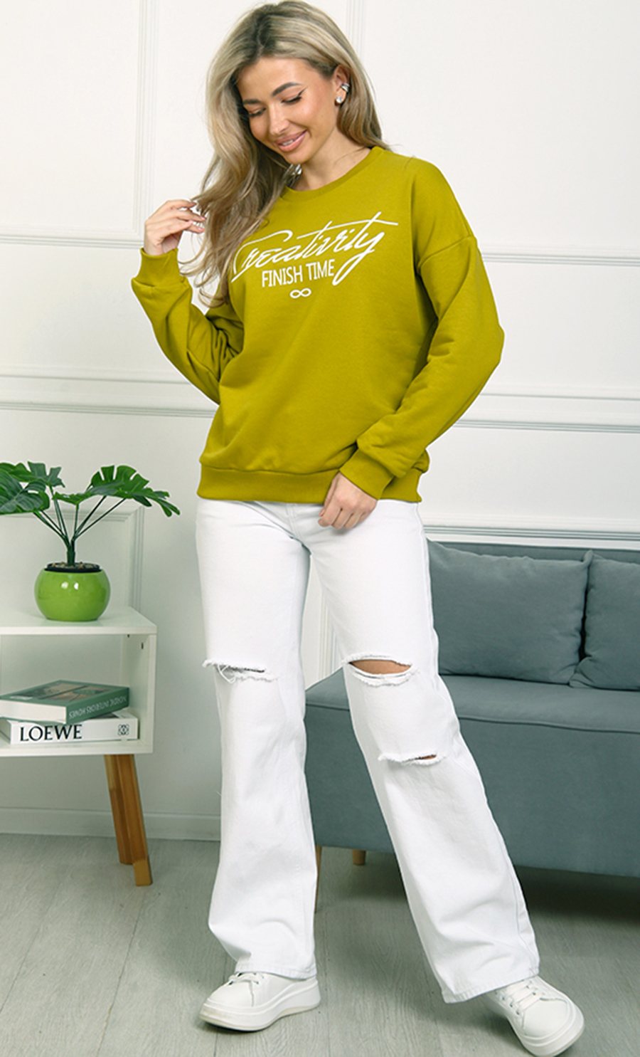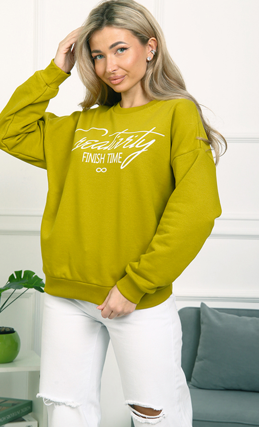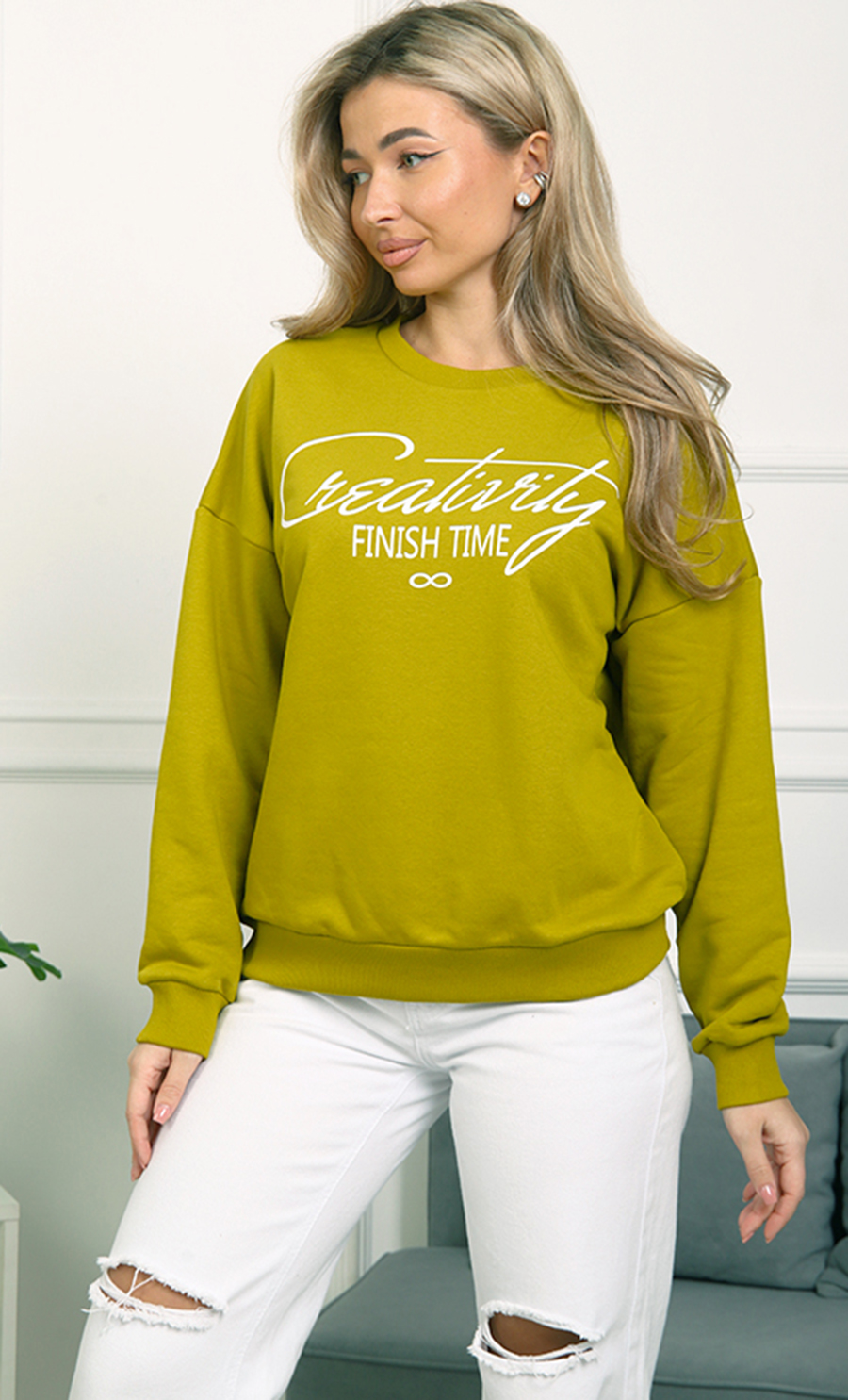 Толстовка БК-4807 / 2 выполнена из футера 3-нит петля (96% хлопок, 4% лайкра) — мягкого, эластичного материала, обеспечивающего комфорт и хорошую посадку. Свободный крой со спущенными плечами и эластичные манжеты создают уютный и стильный образ. Надпись “Creativity Finish Time” добавляет изделию модный акцент.