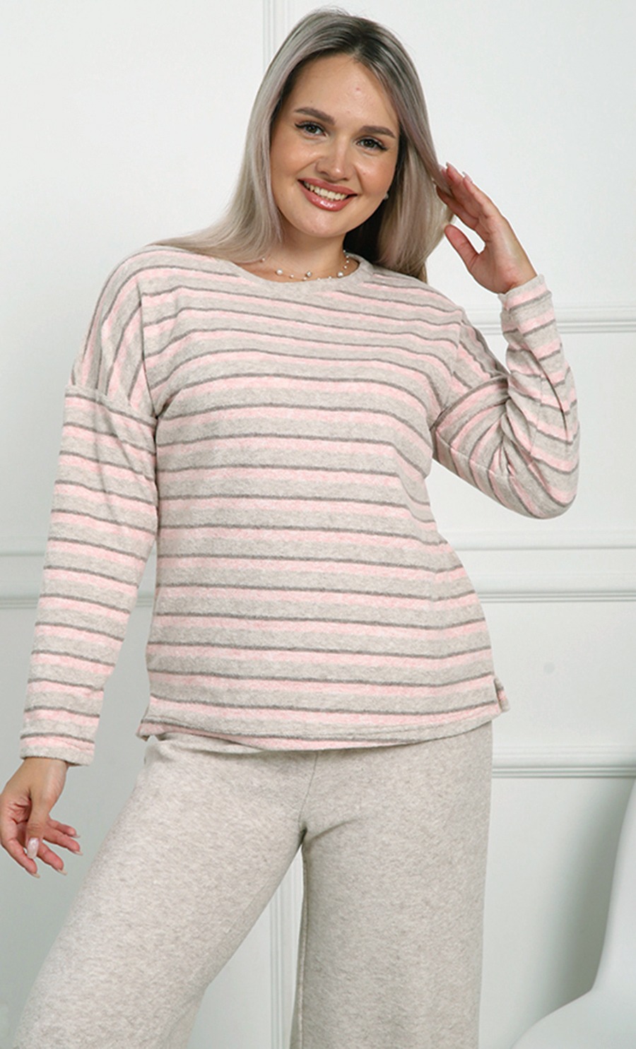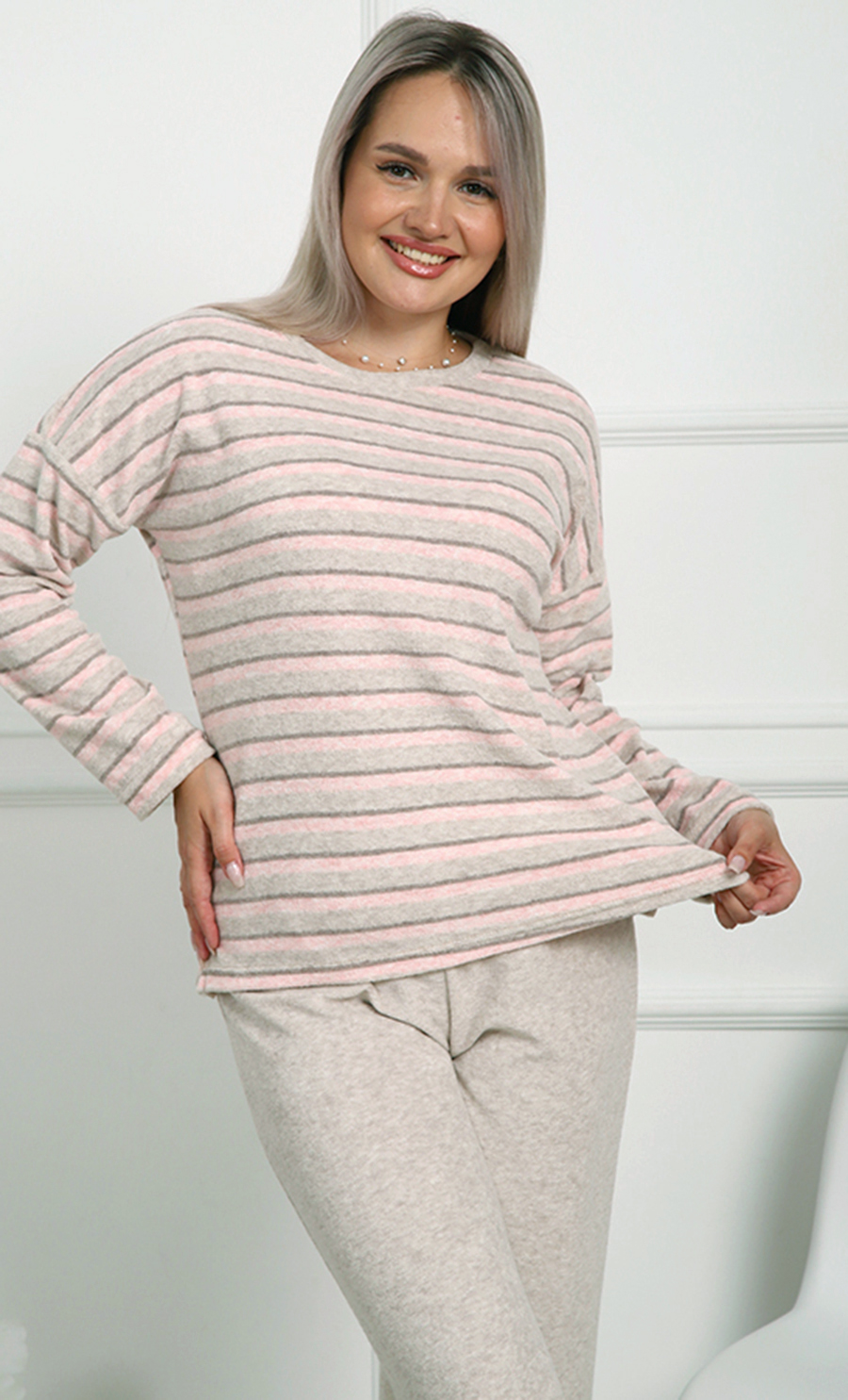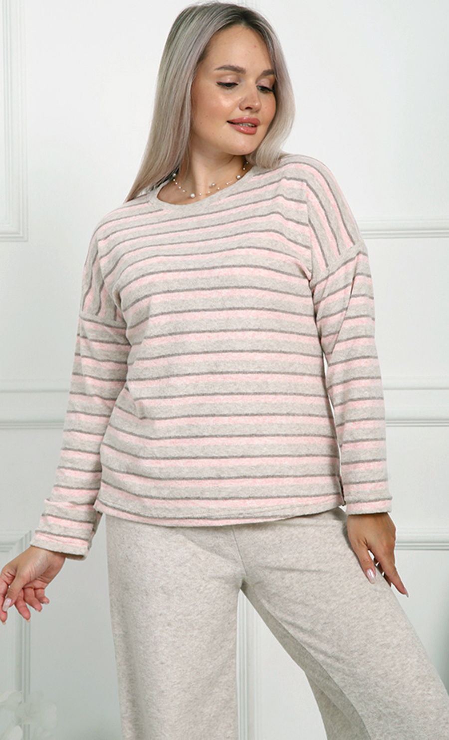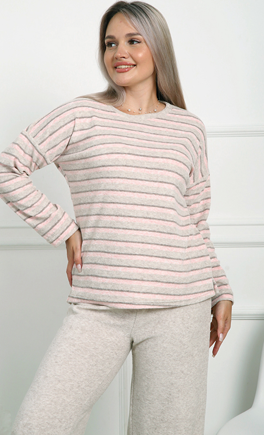 В дизайне используются нежные пастельные тона с тонкими полосками, которые придают изделию лёгкую элегантность и универсальность. Свободный крой кофты и брюков обеспечивает максимальную свободу движений и подходит для полного размерного ряда 44-58.