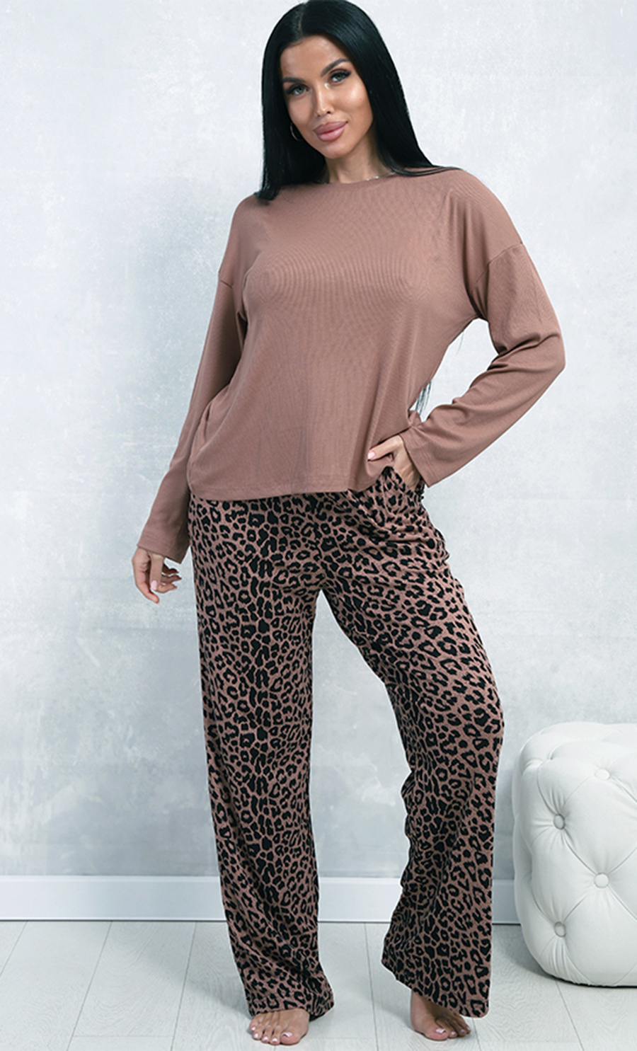 Цвет: топ коричневого цвета, брюки с леопардовым принтом