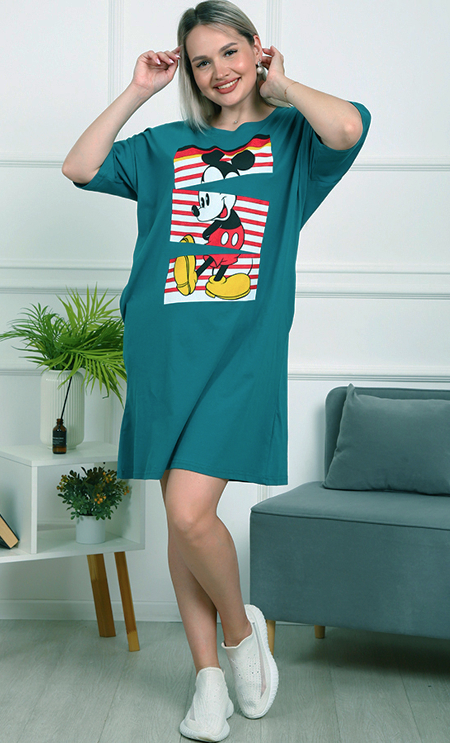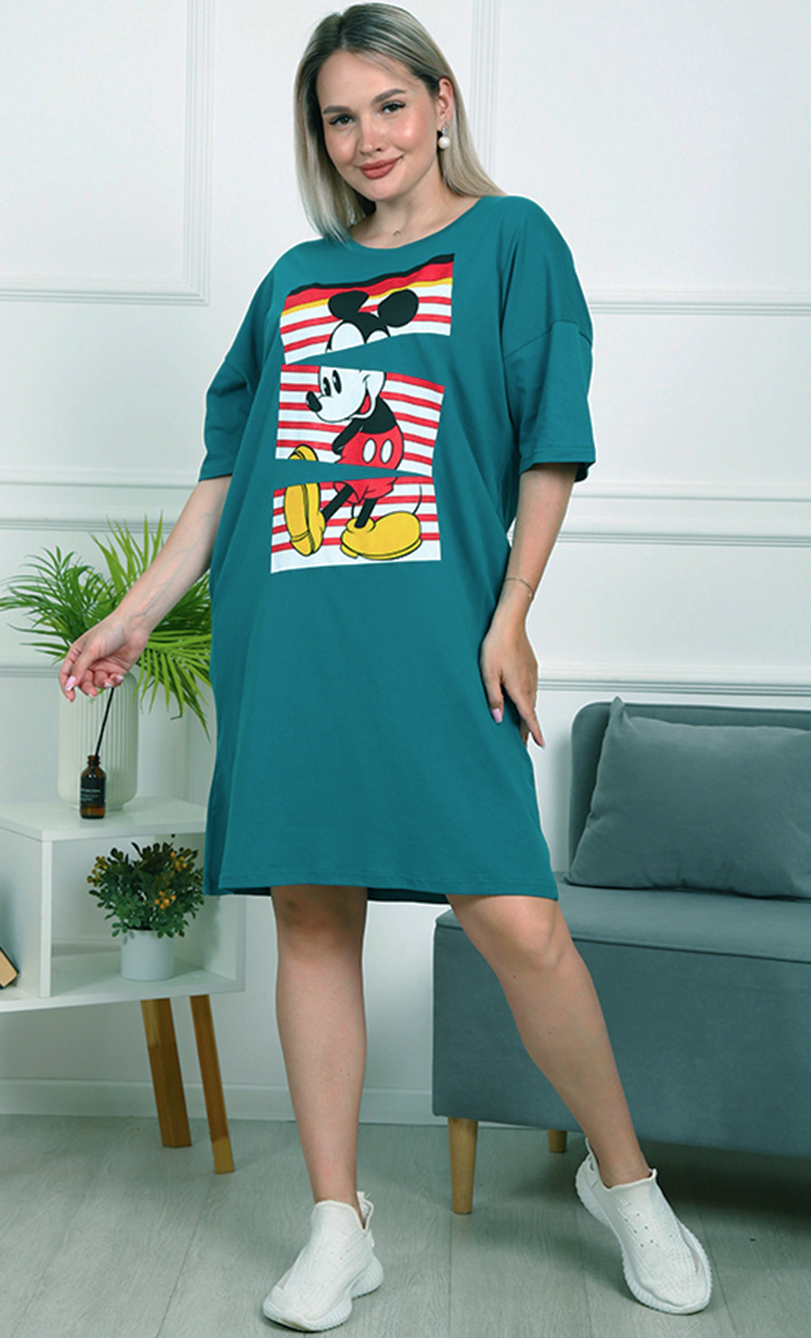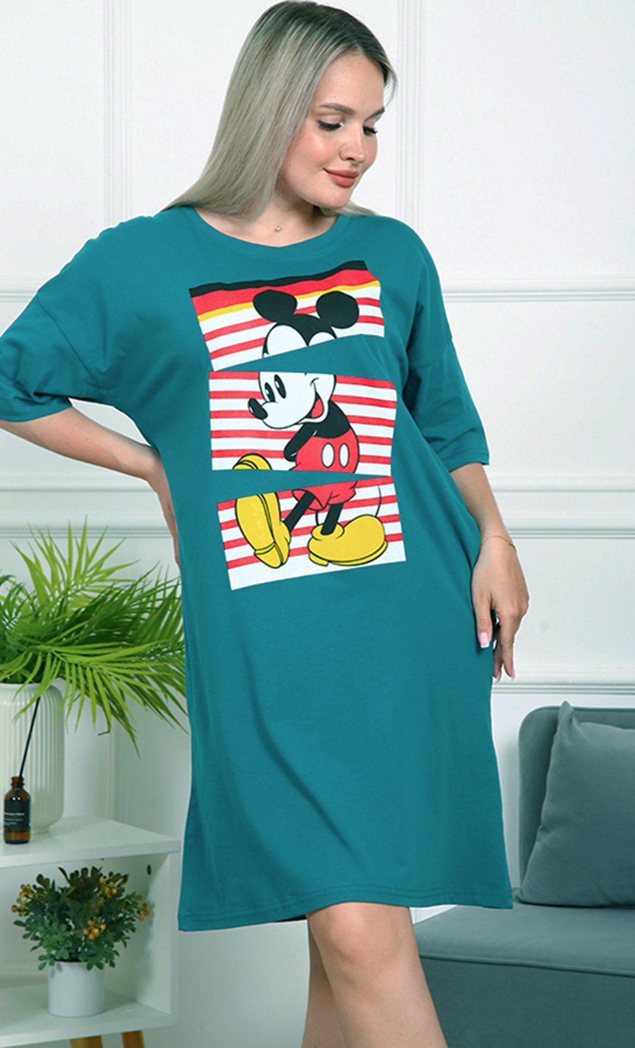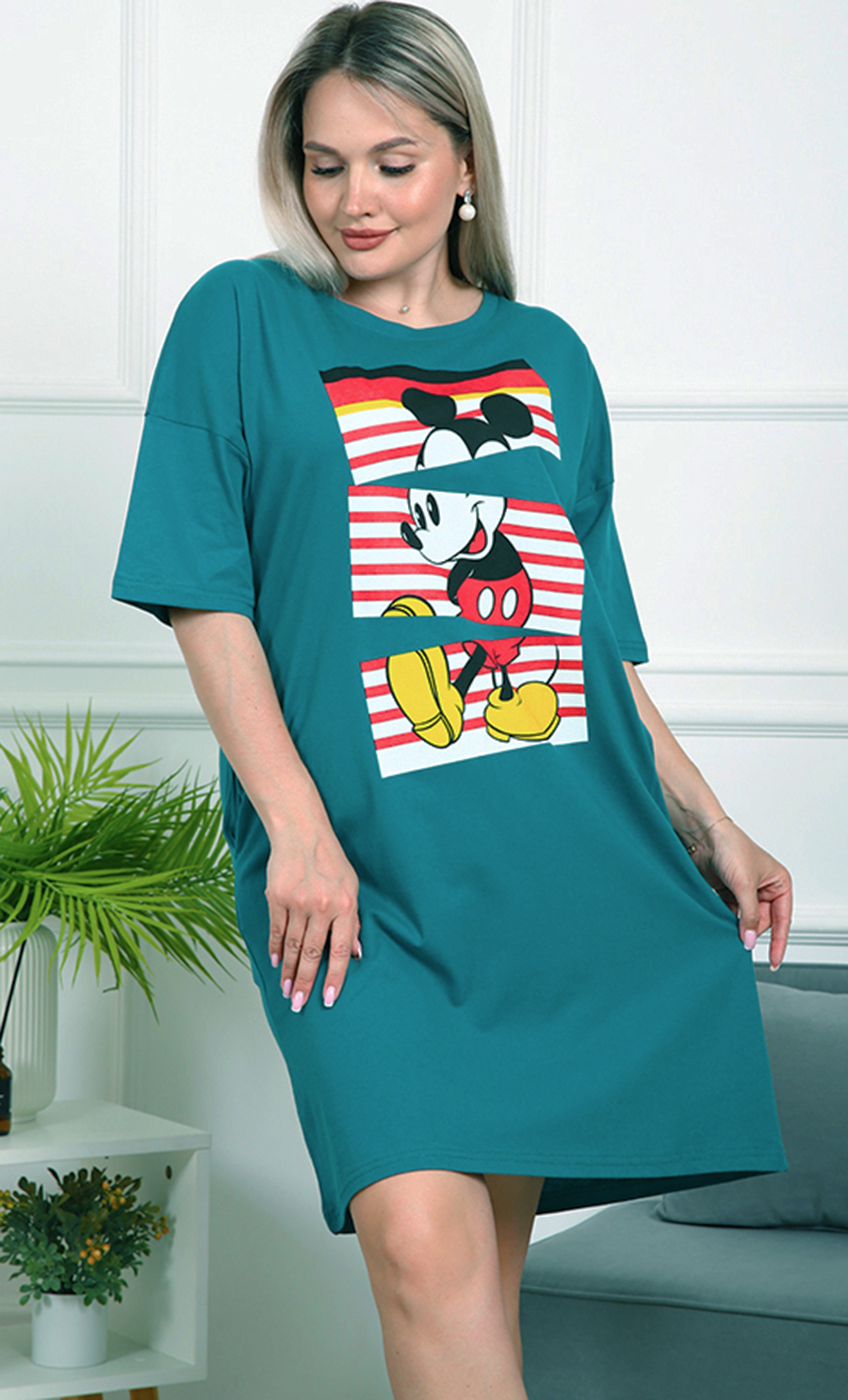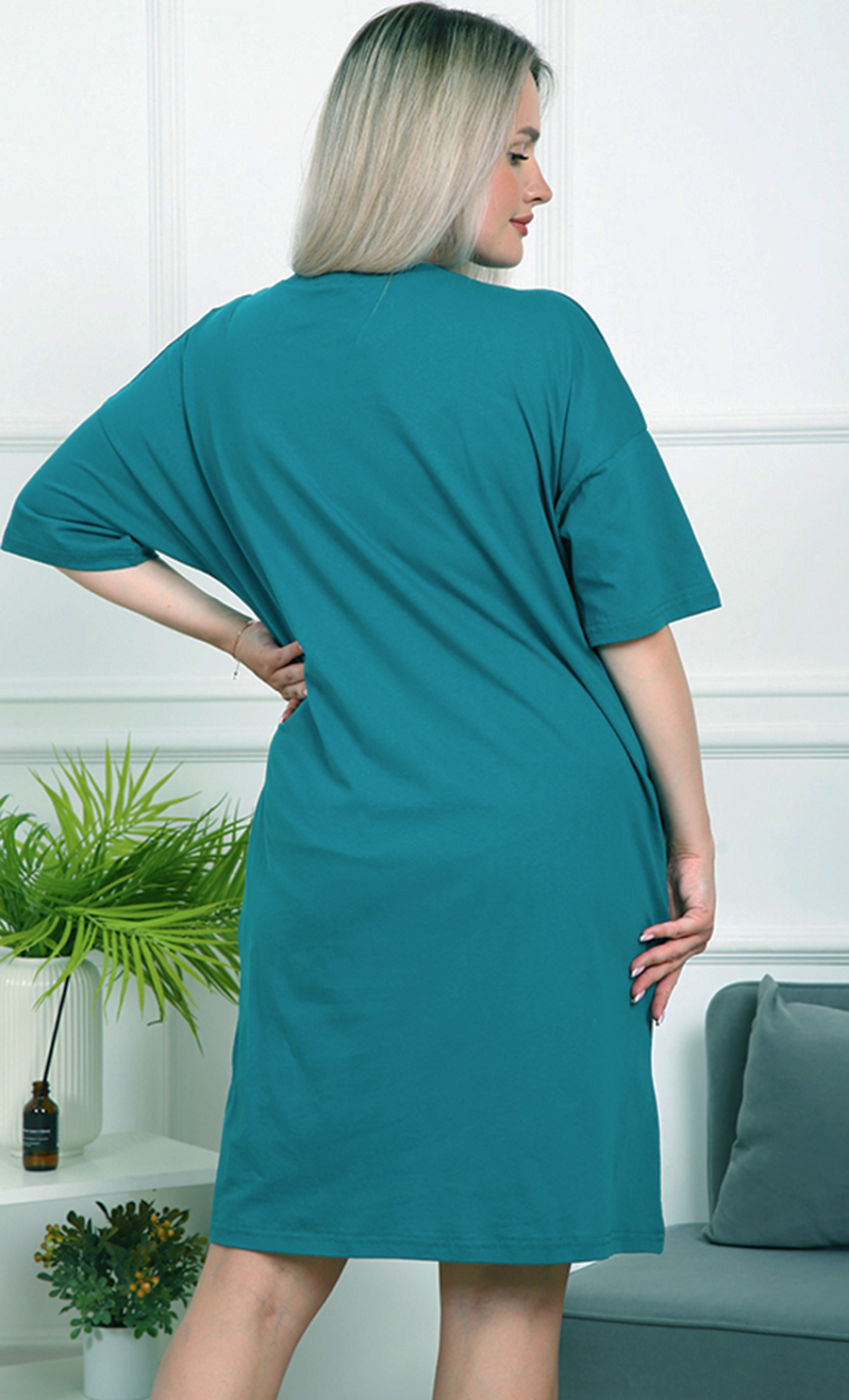 Это платье — идеальный выбор для тех, кто ценит комфорт и яркий стиль. Его свободный крой обеспечивает удобство и свободу движений, а насыщенный бирюзовый цвет добавляет свежести и энергии вашему образу.