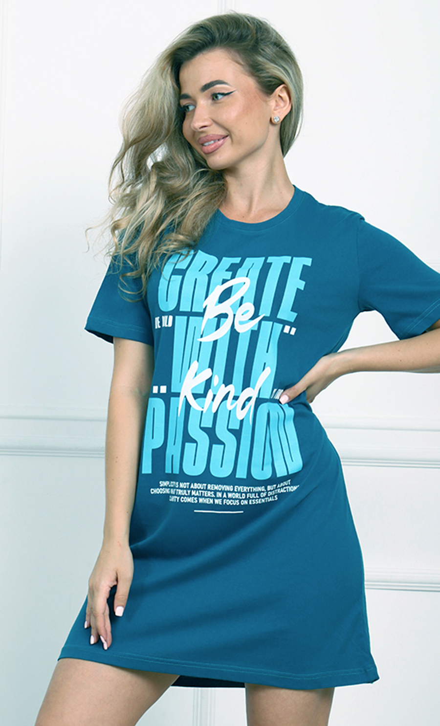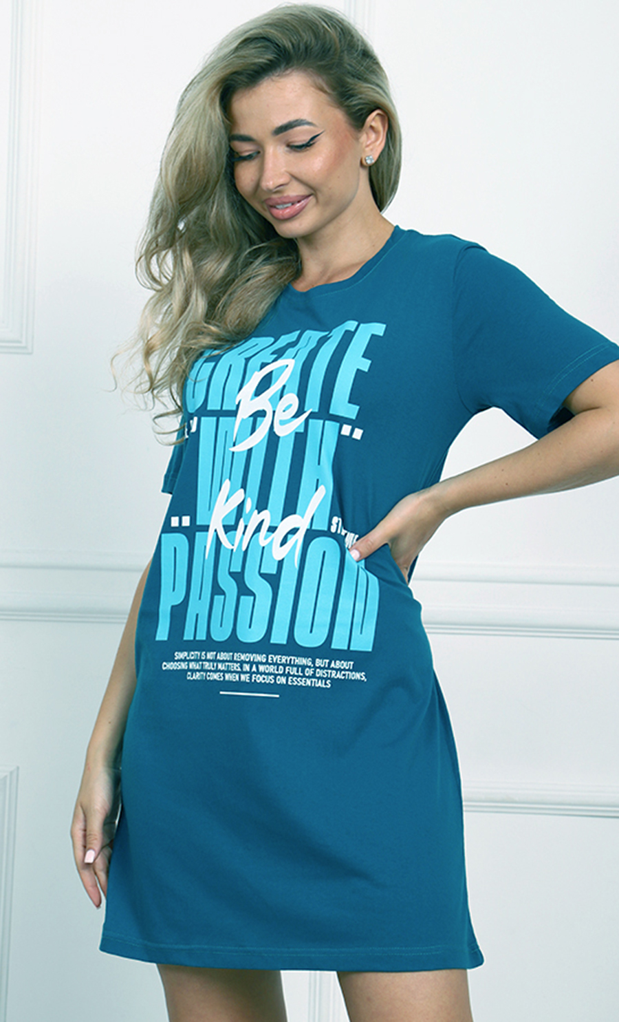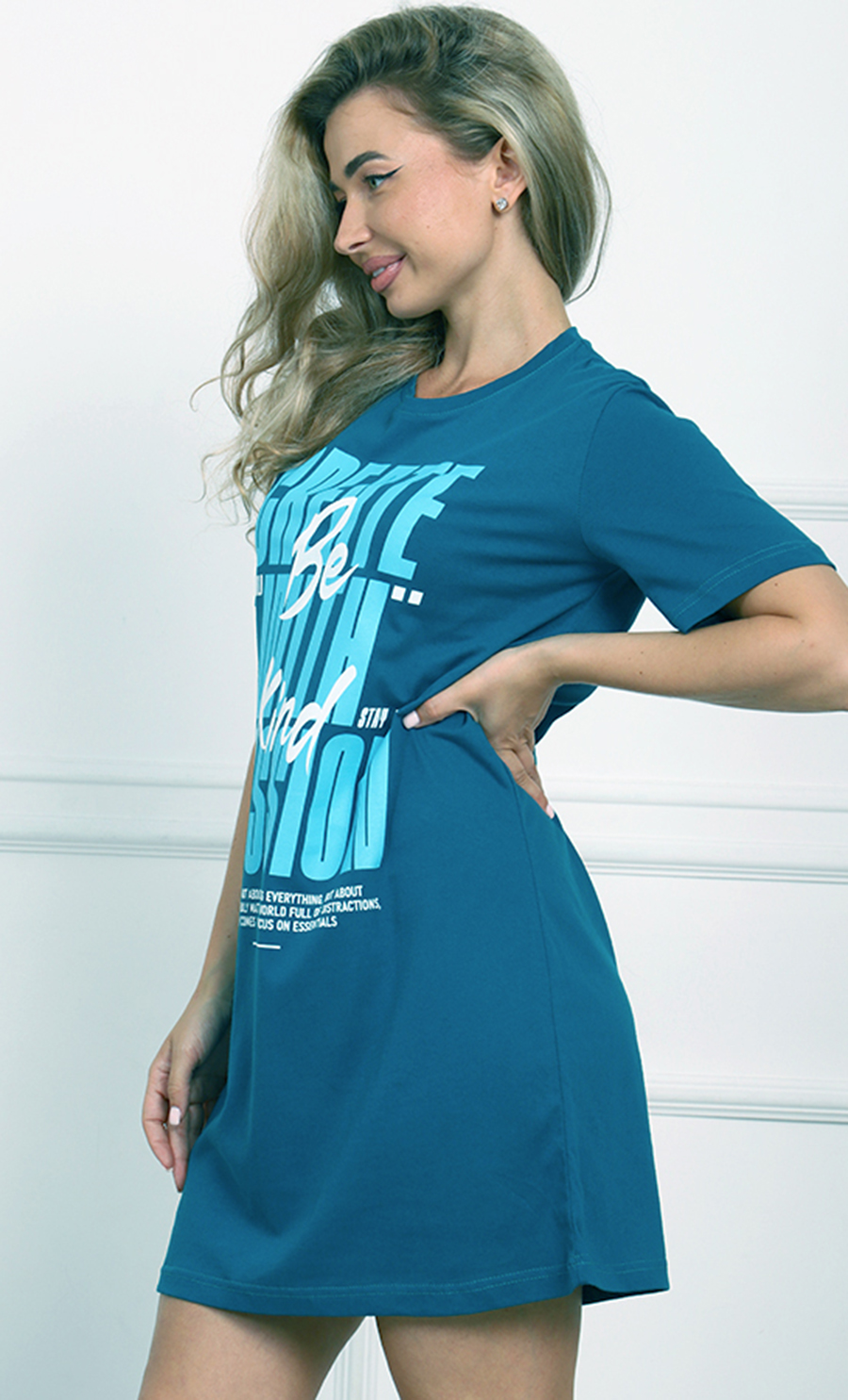 Свободный крой с длиной чуть выше колена создаёт удобный и универсальный силуэт, идеально подходящий для повседневной носки. Яркий синий цвет придаёт модели свежесть и выразительность, а крупный принт «Be Kind» добавляет модный акцент и позитивное послание.